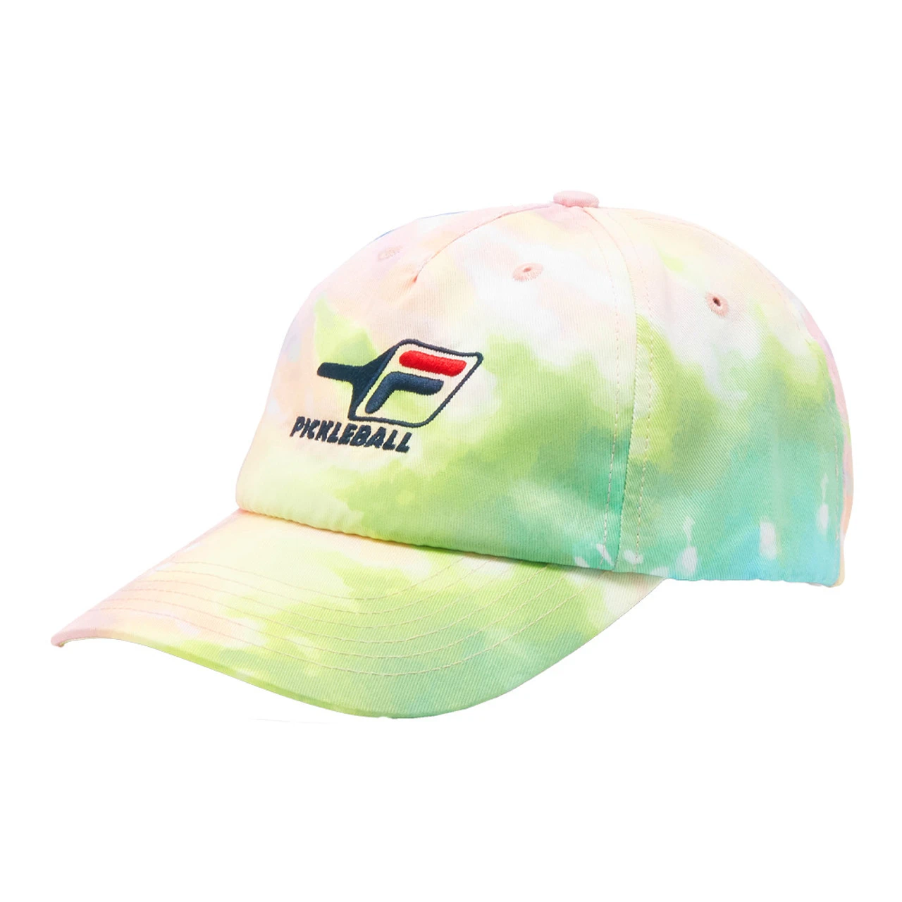 The FILA Pickleball Logo Tie-Dye Hat has a fun and unique style that will add color to your outfit while supporting your play.