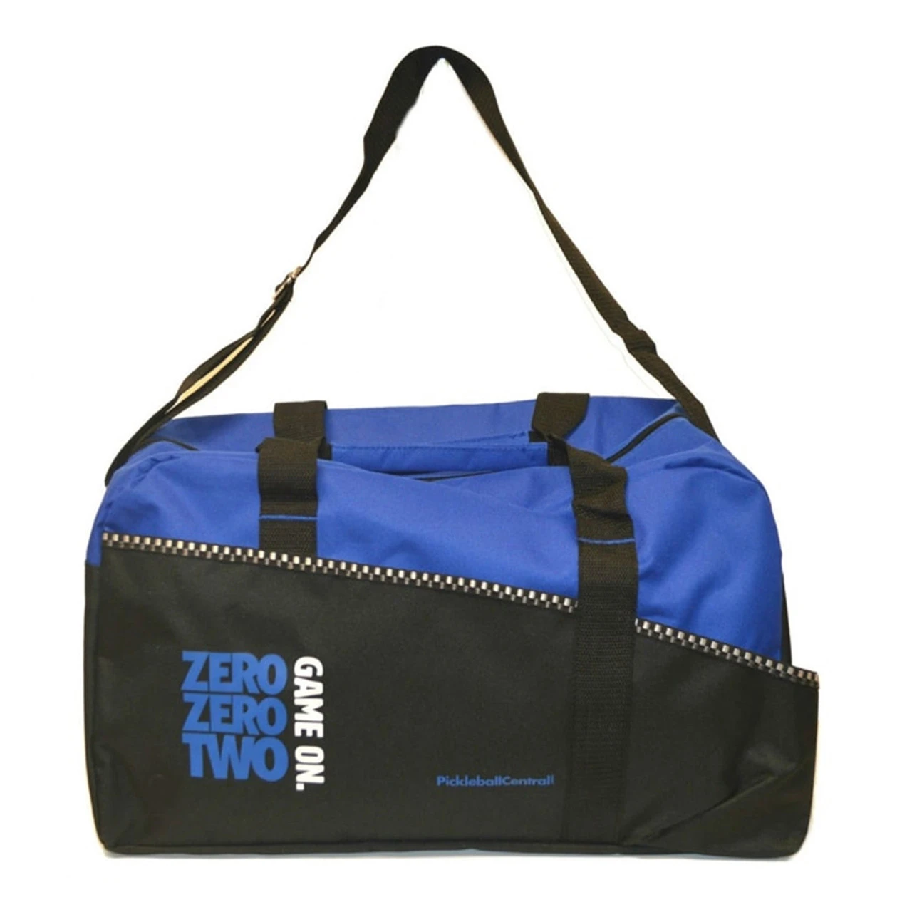 On the front left of the Duffle Pickleball Bag, “ZERO ZERO TWO” is stacked upon itself, with “GAME ON” written along the side of these letters in a contrasting white. To the right of this graphic is the PickleballCentral logo. The upper third of the bag is a vibrant color which matches the fabric-wrapped handle and the graphics on the bag. Dividing this colored portion from the main black body of the bag is white and gray checkered embroidery.