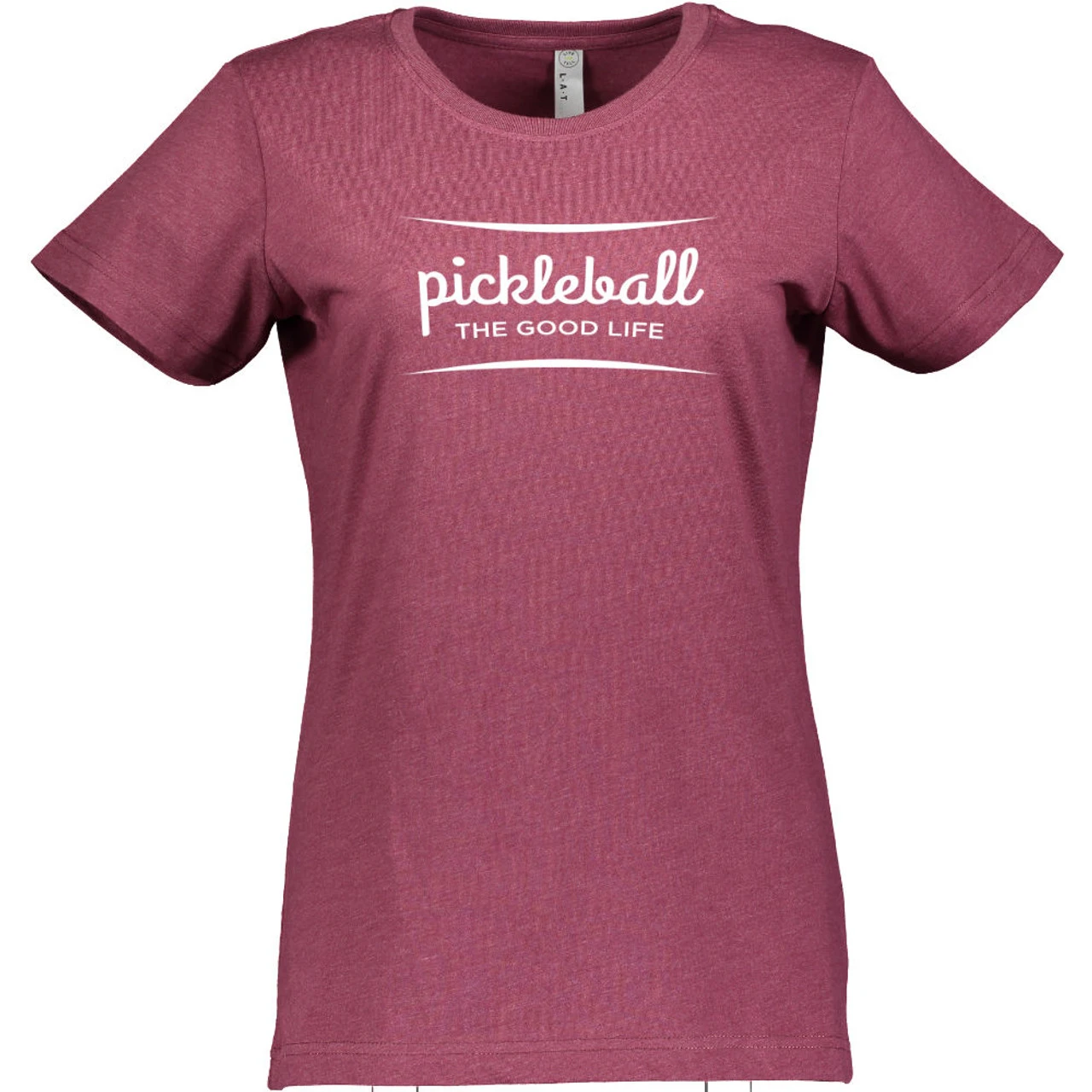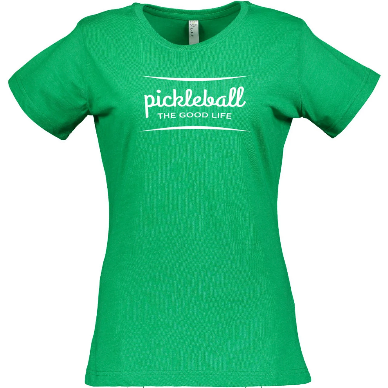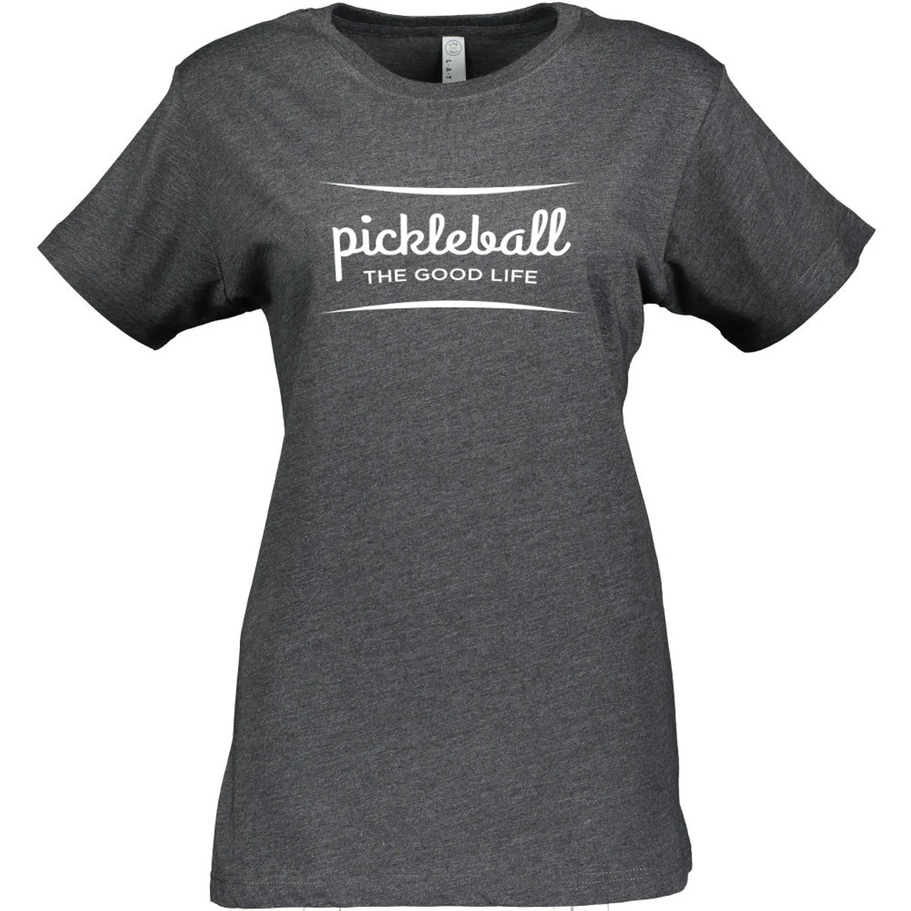 A 9-1/2 inch by 5 inch design is the ideal size to spread a message of positivity to fellow picklers. Enjoy this image featuring the word “pickleball” in a white cursive font and the phrase “THE GOOD LIFE” displayed below. The words are surrounded by a curving border, and it all sits in the front center of your choice of attire. The short-sleeve shirt is 4.5oz cotton/poly blend (90/10 in Vintage Heather; 60/40 in all other colors) fine jersey knit with a topstitched ribbed collar. The style is semi-fitted with double-needle sleeves and bottom hem.