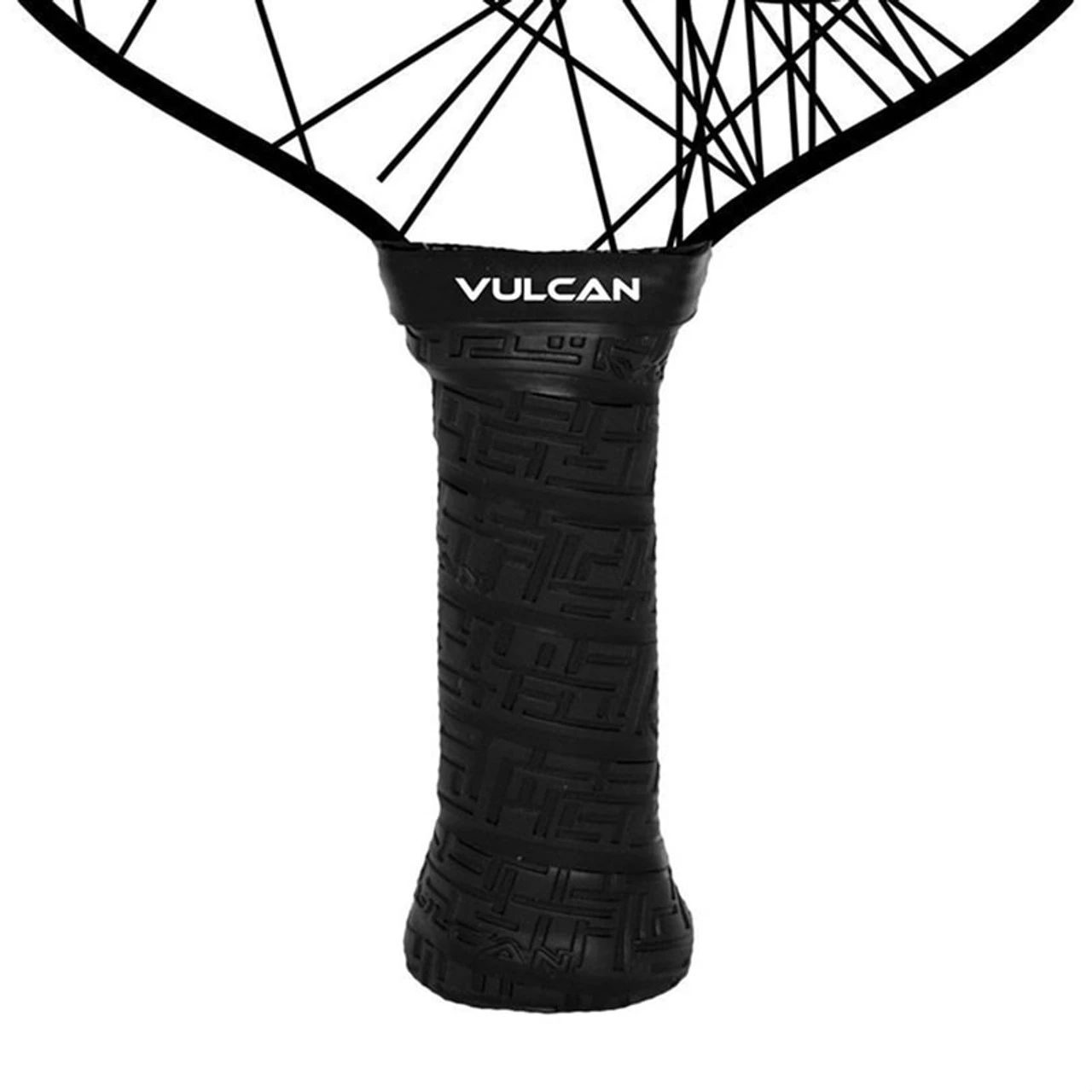 The Vulcan V530 Power Pickleball Paddle averages about 8.5 oz and has a large grip circumference that provides extra cushioning and comfort while you’re in action. The polypropylene core provides vibration dampening and additional punch through its durable construction. The design shows a crisscross of stark black lines with the Vulcan “V” over a white background.